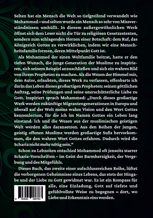 Als Mohammed der einen Weltfamilie beitrat, hatte er den tiefen Wunsch, die junge Generation der Muslime zu inspirieren, sich seinem Beispiel anzuschließen und sich ein wahres Bild von ihrem Propheten zu machen. Als die Wesen der Himmel mir, dem Autor, erlaubten, dieses Werk zu verfassen, offenbarte ich darin das Leben dieses großartigen Propheten: seinen göttlichen Auftrag, seine Prüfungen und seine unerschütterliche Liebe zu Gott. Inspiriert sprach Mohammed: „Durch dieses großartige Werk werden zukünftige Migrantengenerationen in Europa und überall auf der Welt meine wahre Vision und den Wert Gottes kennenlernen, für die ich im Namen Gottes ein Leben lang einstand. Ich und die Wesen aus der muslimischen geistigen Welt werden alles daransetzen. Aus den Reihen der jungen, geistig offenen Muslime werden großartige Sufis hervorkommen, die den wahren Wert Gottes erfahren. Dadurch wird die Scharia nicht mehr nötig sein.“